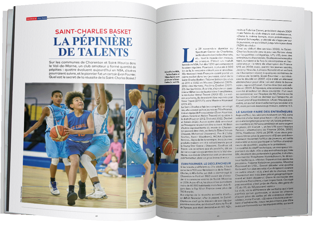 Avec aussi des zooms sur la Saint-Charles Basket, pépinière de talents qui a vu passer Evan Fournier, et trois actuels joueurs NBA (Tidjane Salaün, Pacôme Dadiet et Armel Traoré) ; ainsi qu’un portrait du tout jeune meneur Aaron Towo-Nansi (15 ans, Cholet).