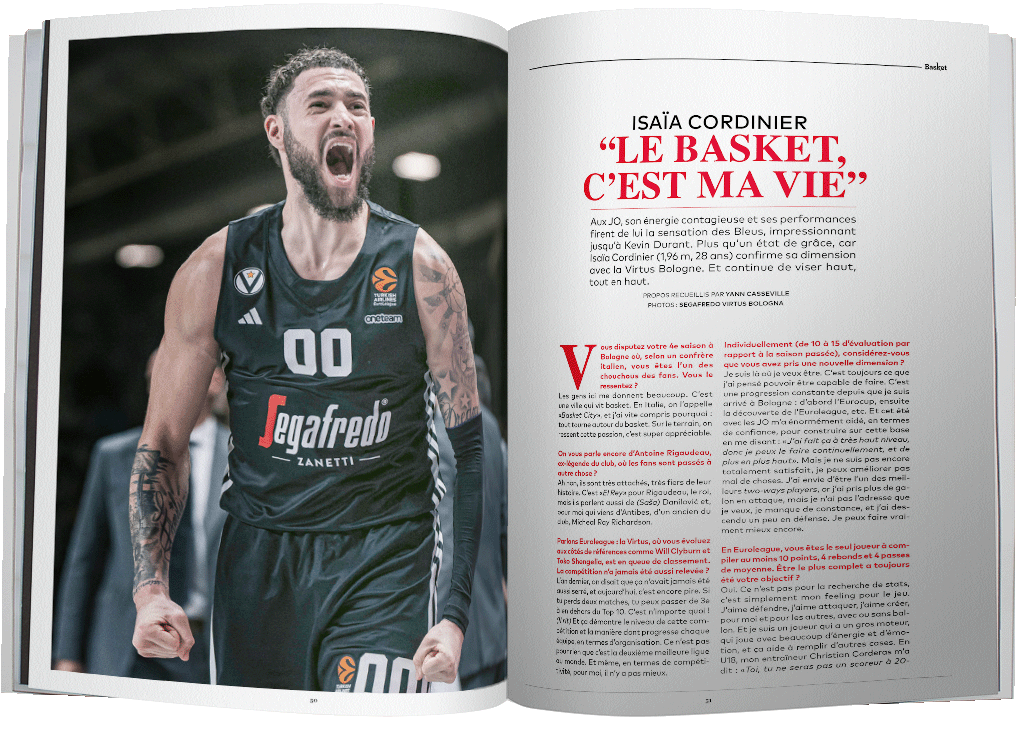 « Le basket, c’est ma vie » : ces mots sont ceux d’Isaïa Cordinier. Sensation des Bleus aux JO, où il fut une révélation pour le grand public et où il a impressionné jusqu’à Kevin Durant, le Français confirme sa dimension à Bologne. Son jeu, son énergie, la NBA, et bien sûr les JO : grande interview !